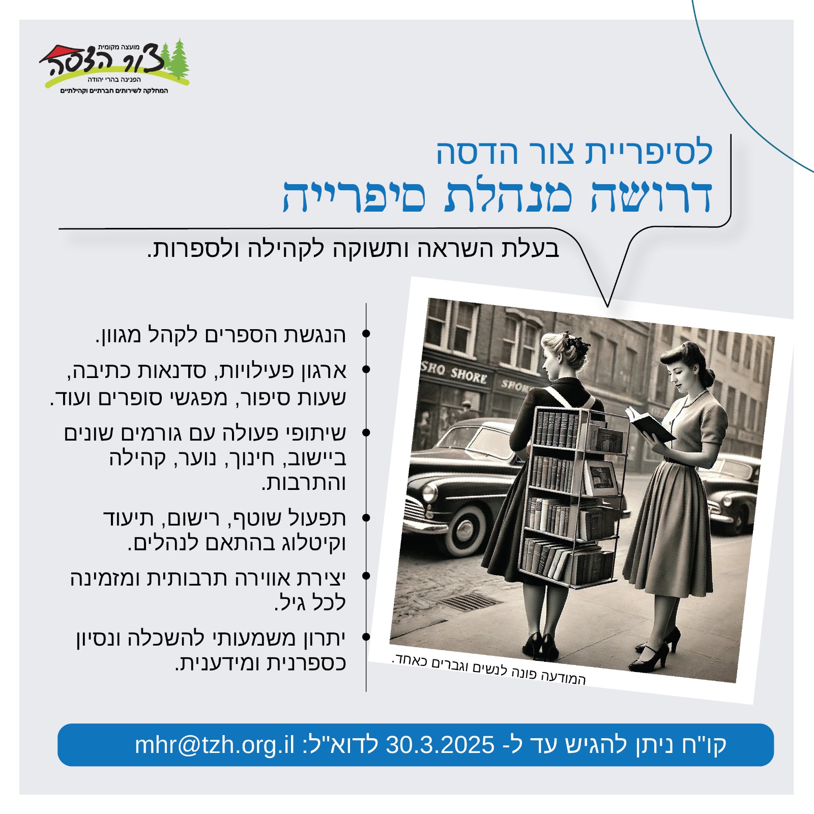 לספריית צור הדסה דרוש מנהל או מנהלת ספרייה - מכרז מס' 33/24
