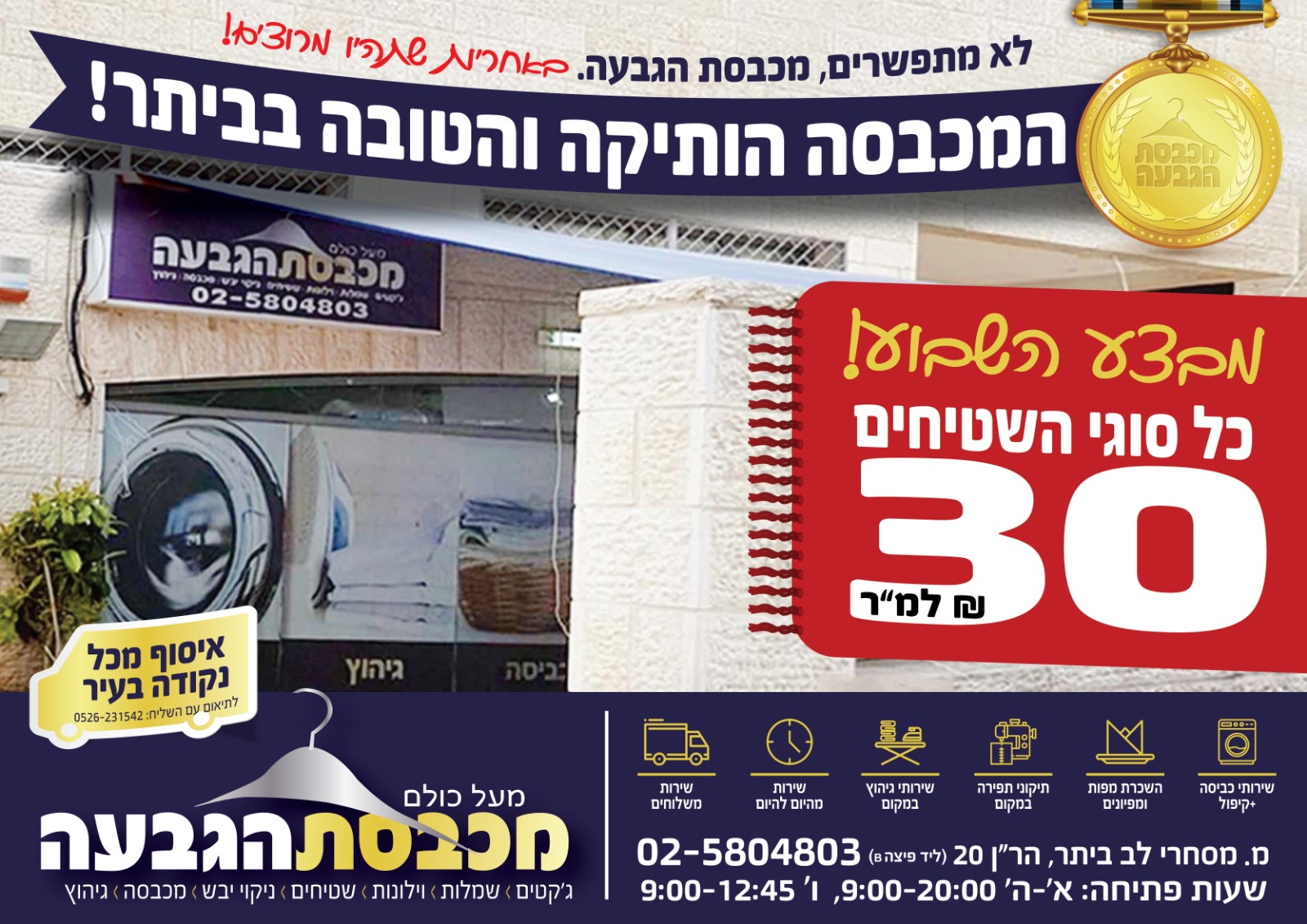 אנו מציעים את כל שירותי המכבסה והניקוי היבש לכל מוצרי הטקסטיל בשירות עד הבית! בין השירותים שלנו: כביסה במשקל גיהוץ וניקוי מכופתרות וחליפות ניקוי מצעים, שמיכות וכריות ניקוי שטיחים ווילונות ועוד..