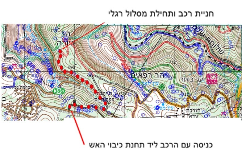 נוסעים מכיוון צור הדסה על כביש 386 לכיוון היישוב בר גיורא. באמצע הדרך, לפני הכניסה ליישוב, סמוך לתחנת כיבוי האש – פונים ימינה לשביל עפר ונוסעים בזהירות צפונה לכיוון הר גיורא (ראו תמונה 1). המשיכו עד שתגיעו לנקודת החנייה.