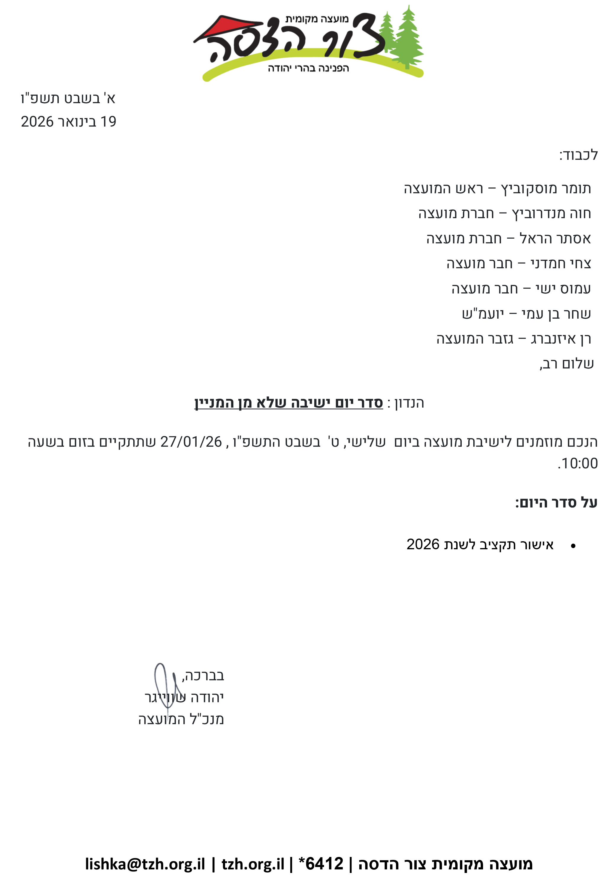 הנכם מוזמנים לישיבת המועצה שלא מן המניין, שתתקיים בזום, ביום שלישי, ט' בשבט התשפ"ו , 27/01/26, בשעה 10:00.