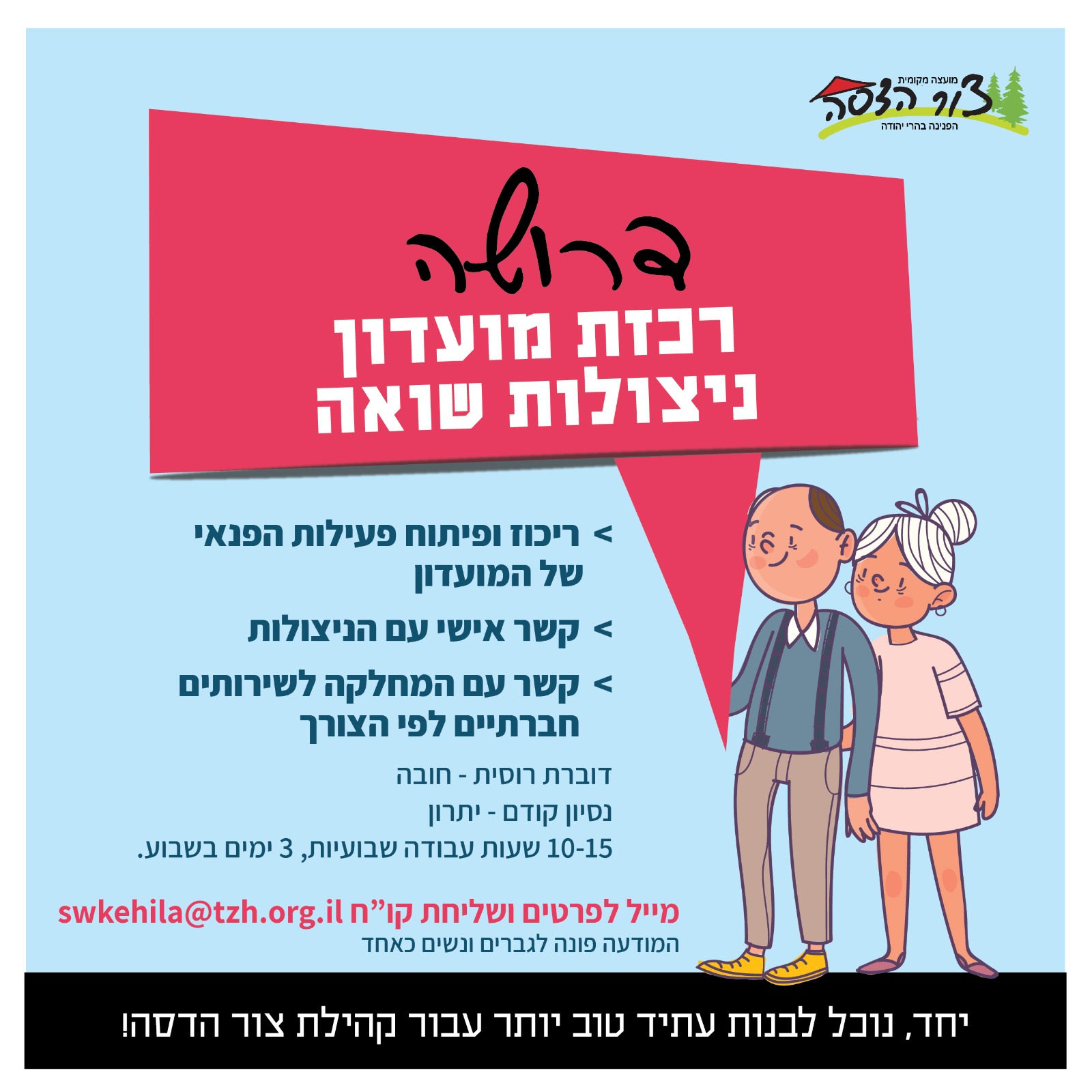 למחלקה לשירותים חברתיים וקהילתיים דרושה רכזת מועדון ניצולות שואה דוברות רוסית בצור הדסה