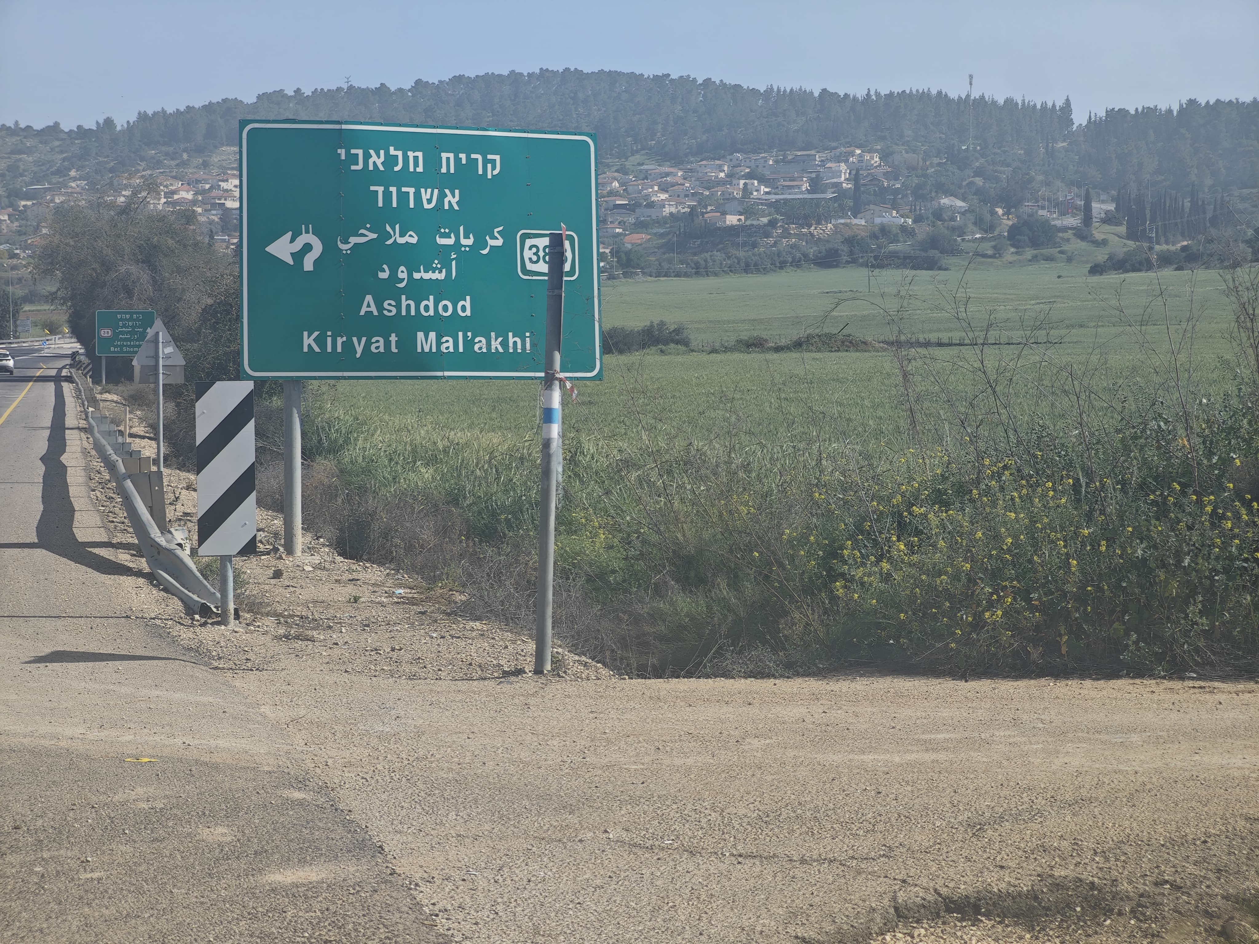 לאחר נסיעה קצרה של 1.2 ק"מ, פונים שוב ימינה לדרך עפר (שימו לב לשלט הירוק לקריית מלאכי ואשדוד ולסימון השבילים הכחול על העמוד).